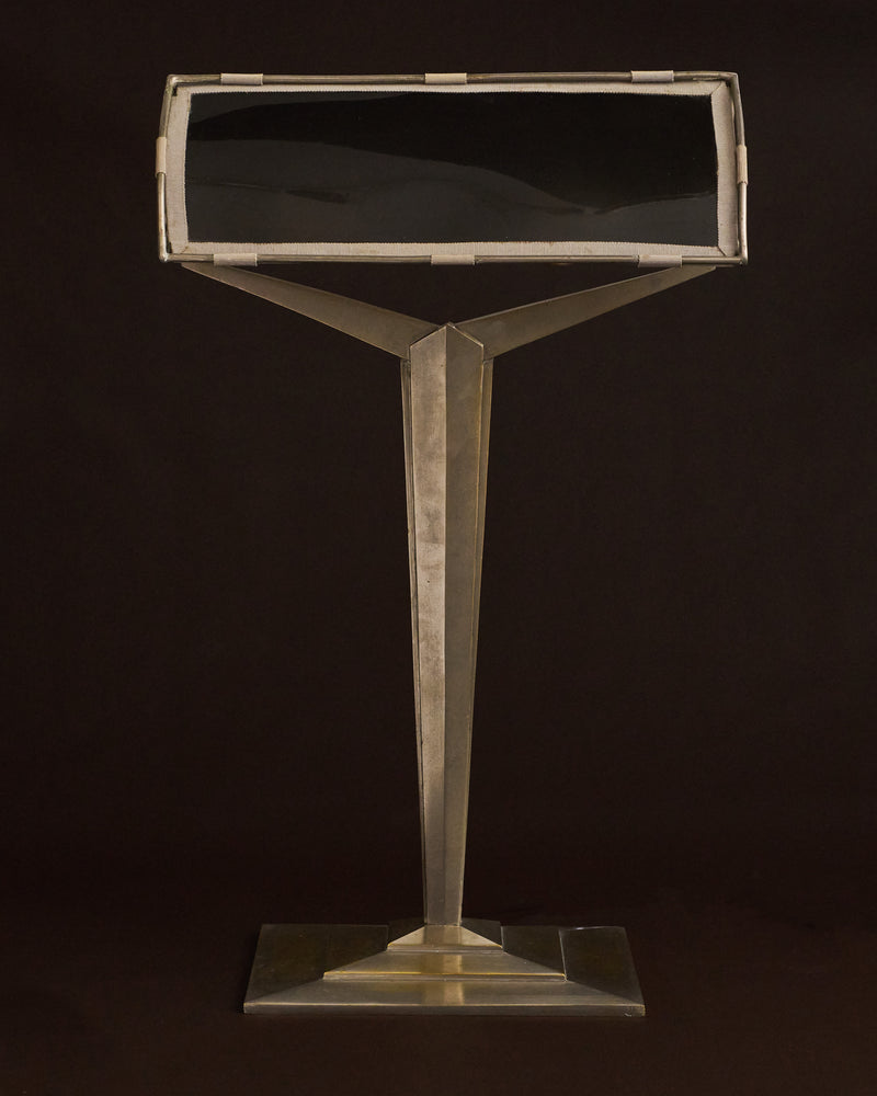Ebony and ivory lacquer. Brass and mirrored steel.